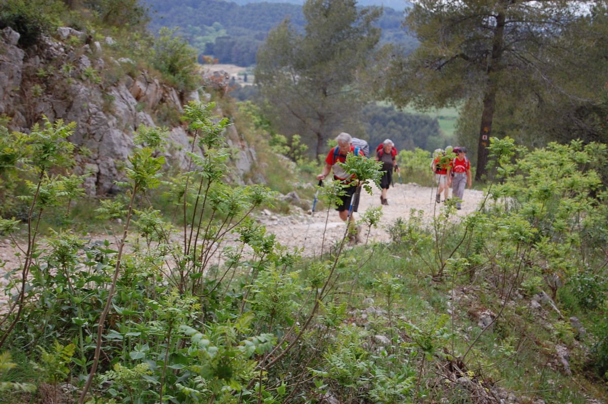 On apprécie sa verdure et sa fraicheur avant la montée de la Candole (300 mètres de dénivellé) massifs rocheux, passages en balcon au dessus d'un cirque impressionnant; Au sommet nous avons fait notre pause picnique, puis la descente vers le pic du télégraphe (vue sur le camps de Carpiagne, Le Mont Puget, Cap Canaille) passage devant une tour en ruine et forte descente pour atteindre une route, passer sous la voie ferrée qui relie Aubagne à Toulon.